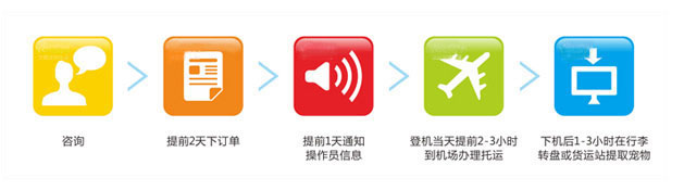 价格服务咨询---提前1-2天通知客服---提前1天通知客户相关操作员信息---提前2-3小时办理托运---飞机落地后1-3小时提取宠物;